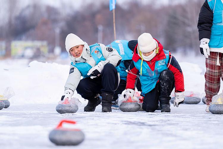 希望與愛手拉手主題公益研學(xué)活動中,孩子們玩室外冰壺