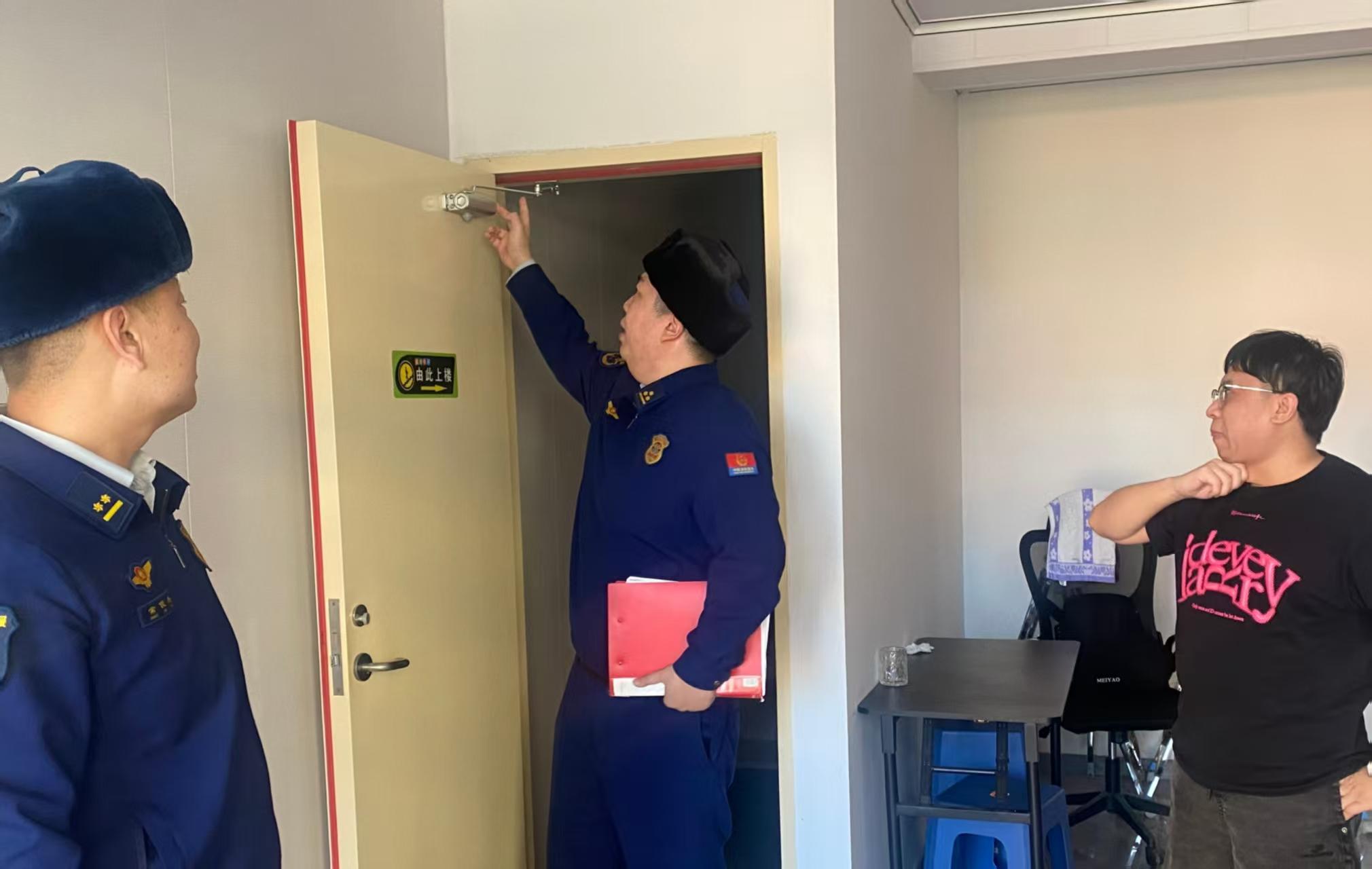 檢查組現(xiàn)場(chǎng)檢查防火門是否完好好用(胡春磊 攝)