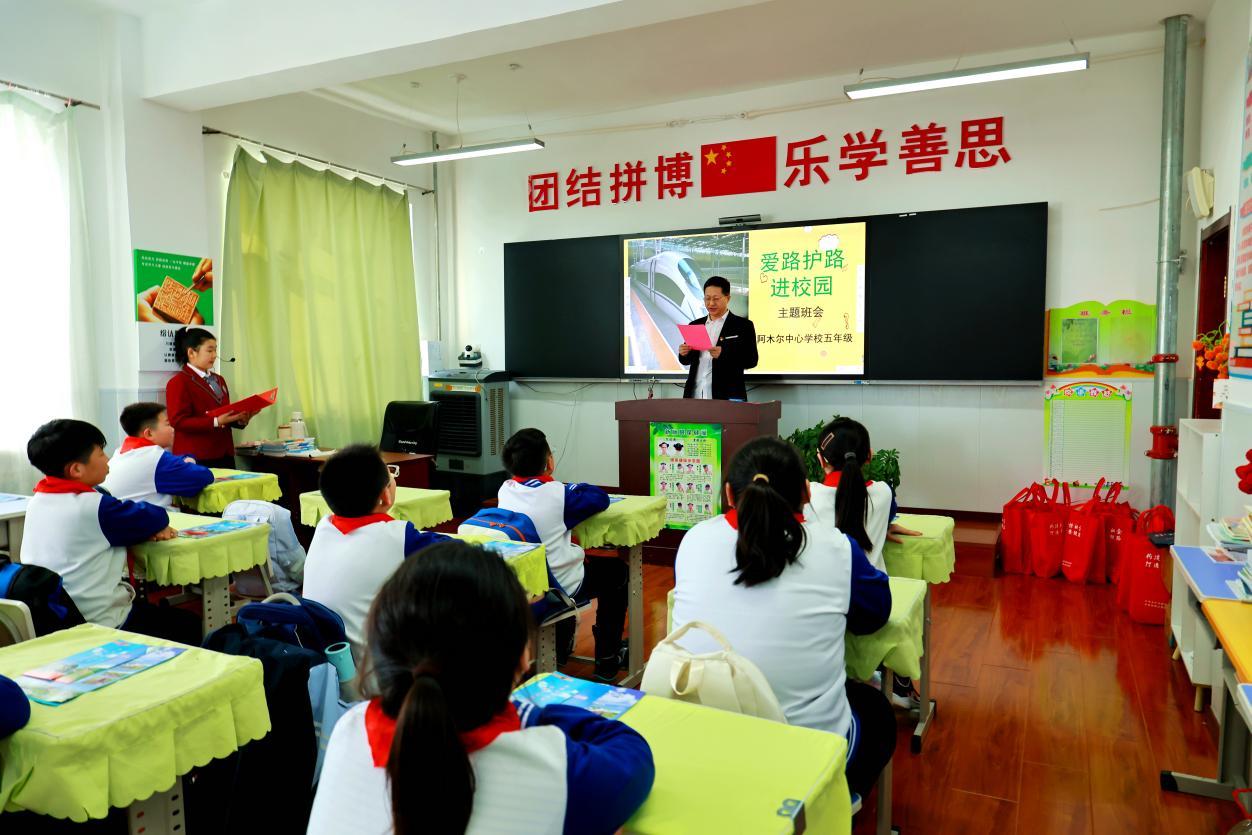 阿木爾向陽派出所的干警與阿木爾林業(yè)局護(hù)路辦工作人員在向小學(xué)生講解愛護(hù)鐵路相關(guān)知識(王力 攝)